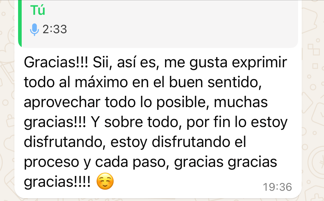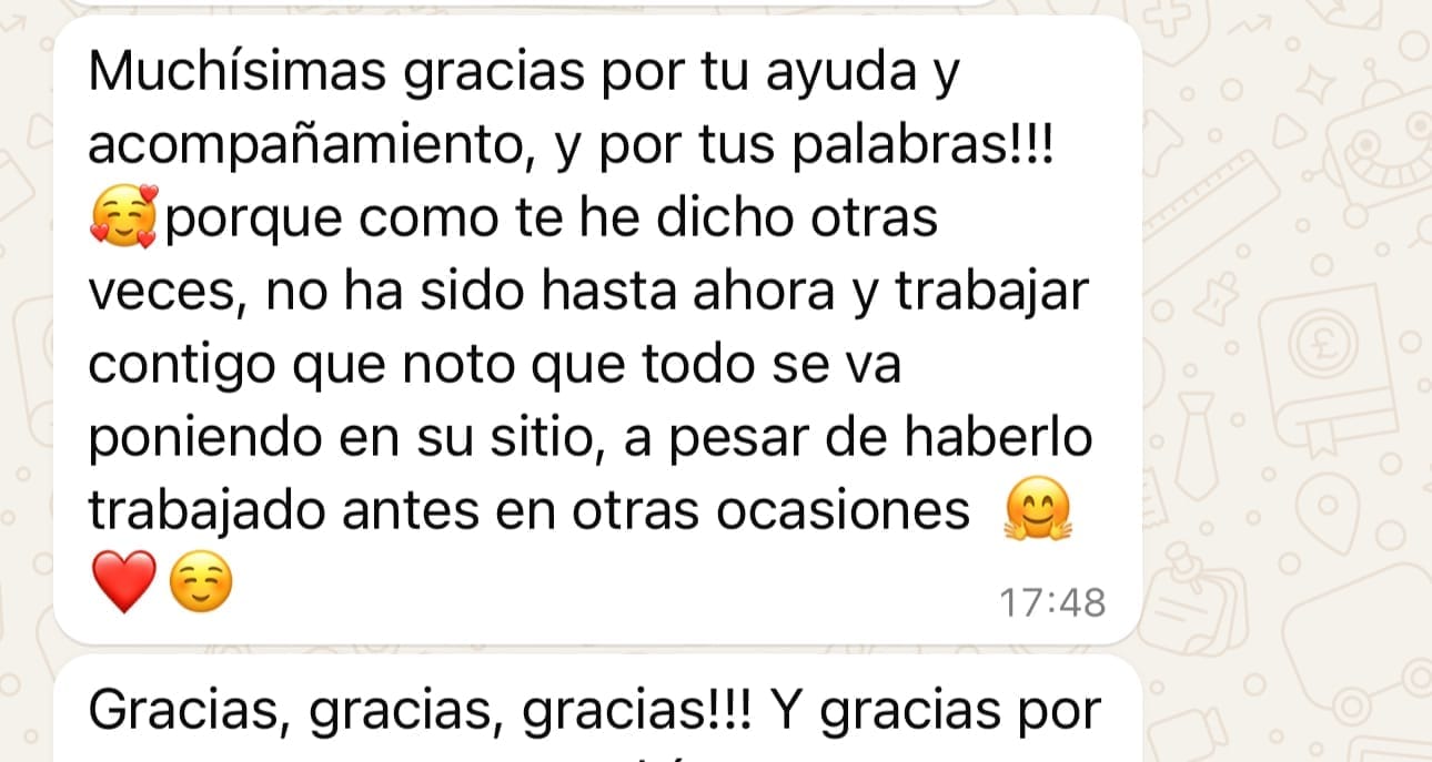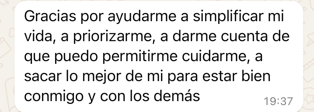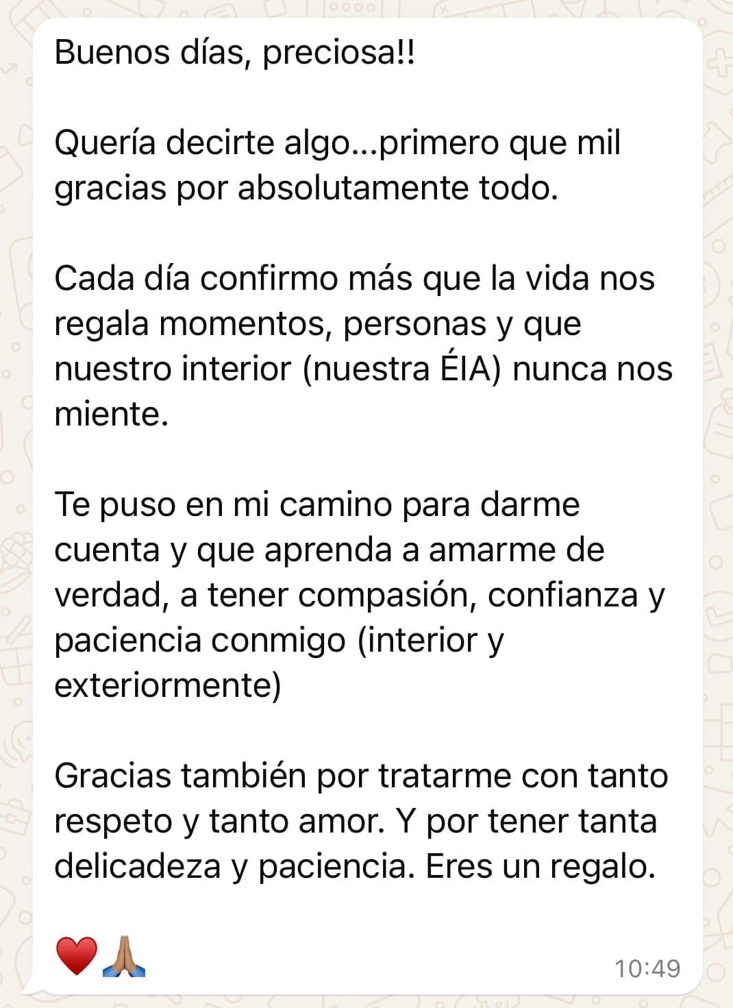 Durante todo el proceso tendrás un canal privado abierto conmigo (vía Telegram) de lunes a viernes, para dudas, apoyo o ajustes necesarios. No estás sola entre sesiones. Estarás acompañada y serás escuchada. Para mí, es muy importante el contacto con el cliente para que no se sienta solo.